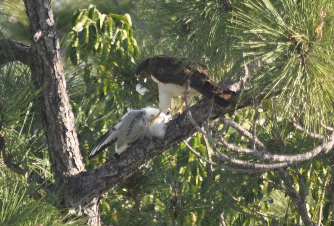 A month or two after the broad wing baby perched on the poinciana outside, it was back, across the street, carrying a seagull in its talons. That seagull, was, dead. The burder, unwitnessed, had already occurred. In the aftermath, the broad-wing hawk was plucking him bare in broad daylight.