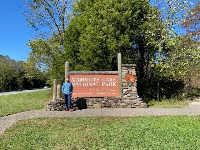 Me, standing at one of the Mammoth Cave entrance Signs. (not the one which features on the title page.)
